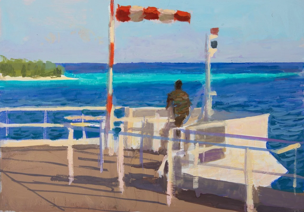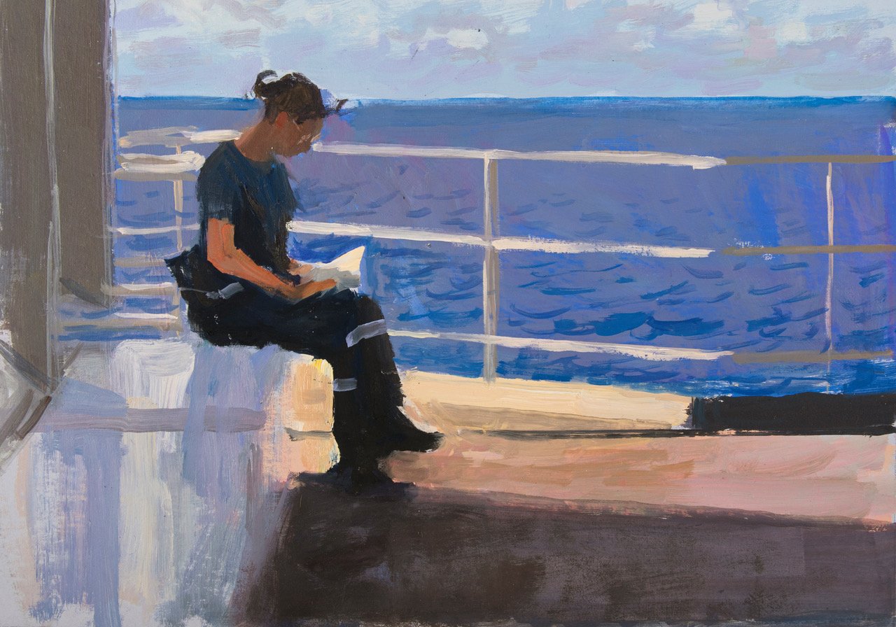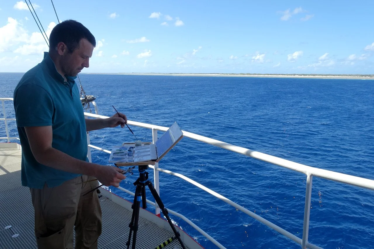 "J’ai été nommé Peintre Officiel de la Marine en 2018 et ma première expérience de vie avec les militaires a eu lieu en mai 2022. J’ai embarqué à bord de l’Astrolabe pendant 1 mois avec une quarantaine de marins. Il y avait aussi plusieurs militaires de l’armée de terre à bord. Nous allions naviguer dans l’Océan Indien pour ravitailler les îles Eparses. J’étais là pour peindre : le ciel, la mer, le bateau, les militaires au travail, en exercice.